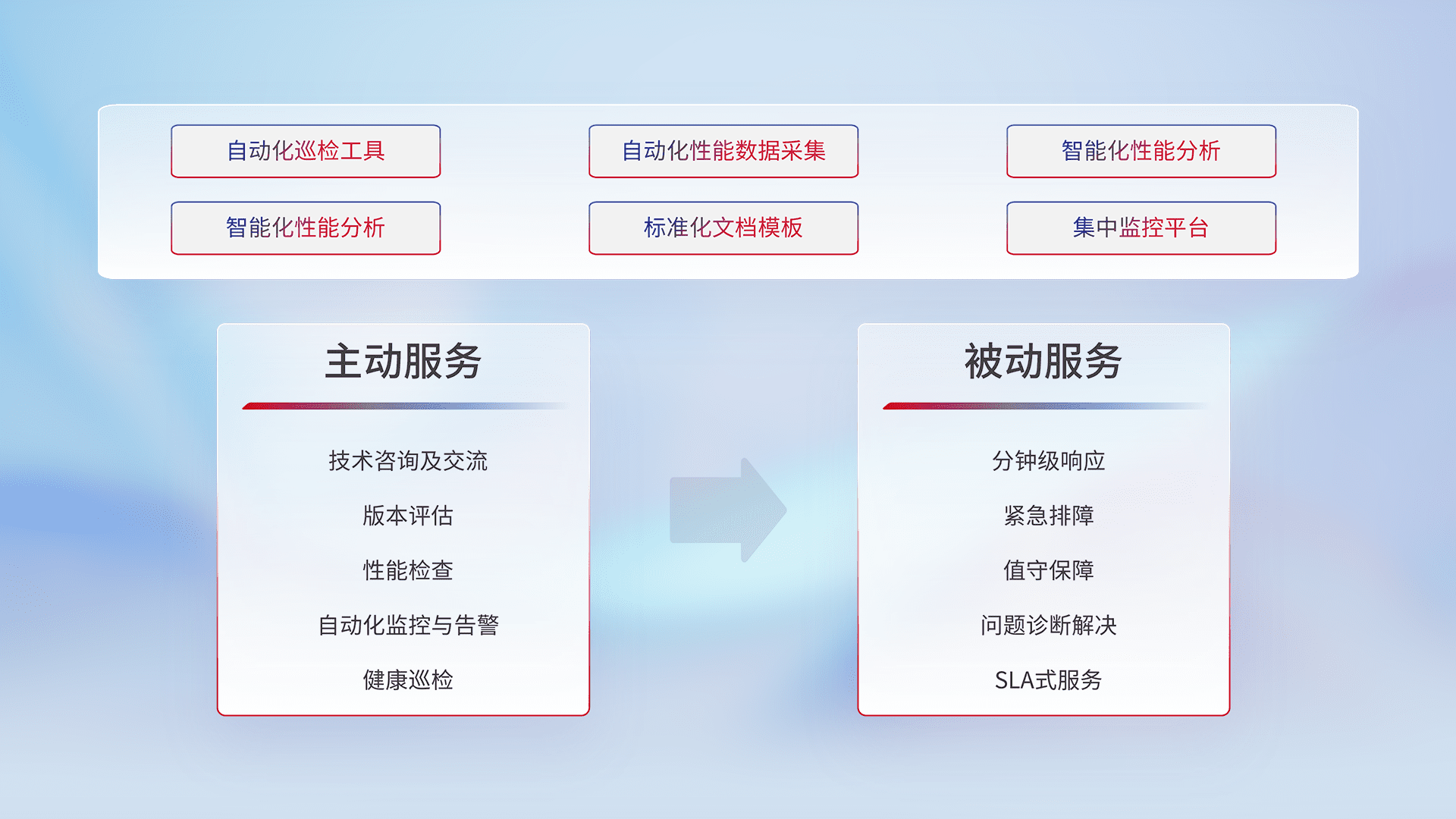智能化工具和标准化文档,,保障服务质量,,,,提供主动服务(包含技术咨询、、、、版本评估、、性能检查、、、、自动化监控与告警、、、、健康巡检)和被动服务包含(分钟级响应、、紧急排障、、、值守保障、、、、问题诊断解决、、、、SLA服务)。。